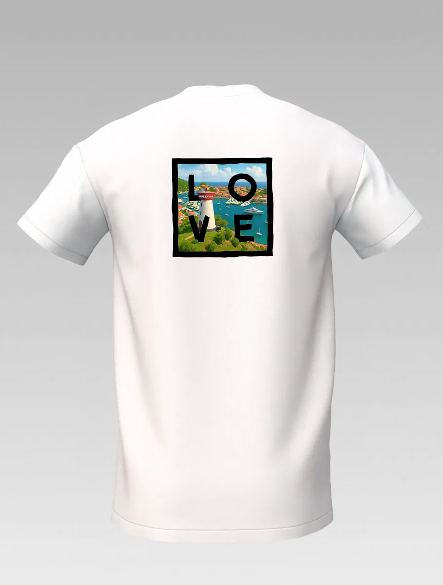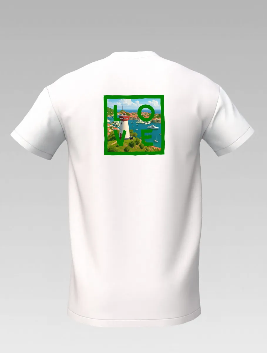 This white T-shirt from St Barth Signature, part of the LOVE Edition, celebrates the beauty of Gustavia Harbor, where boats rest on crystal-clear waters and colorful houses light up the horizon.