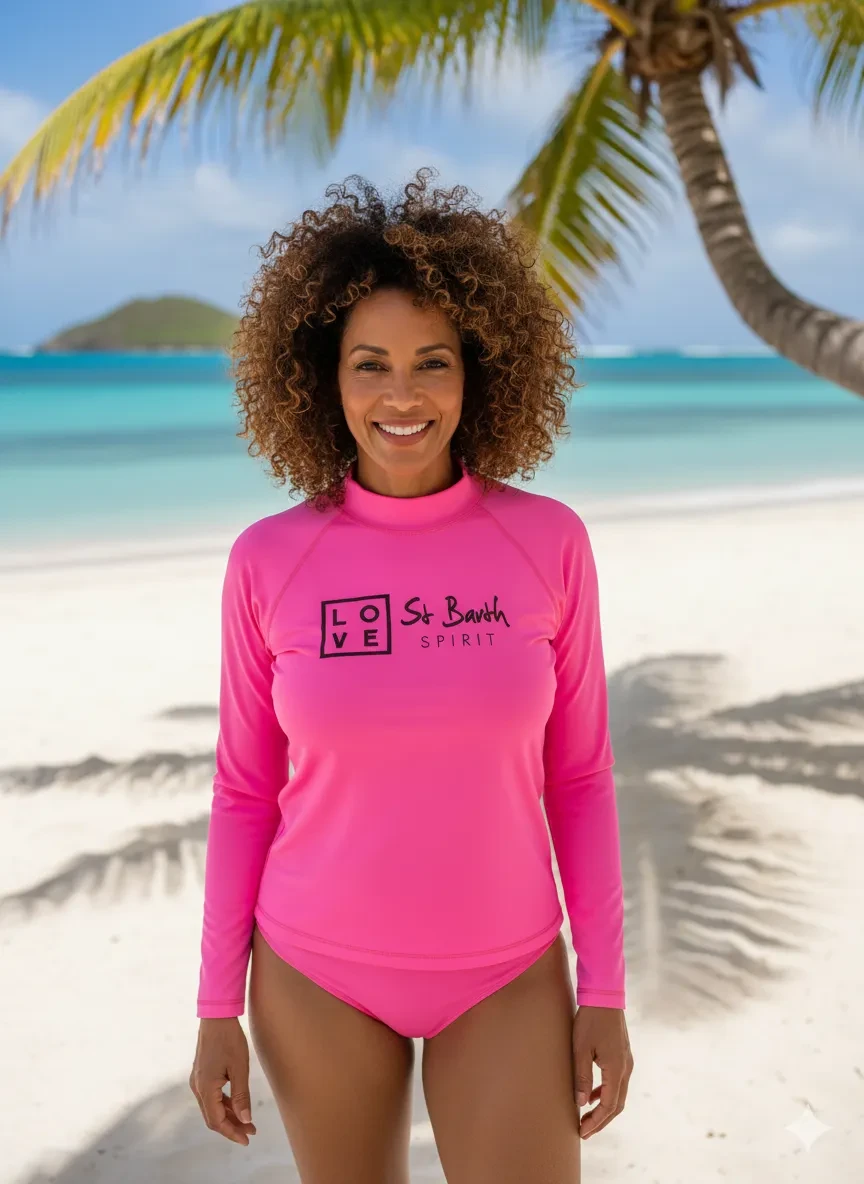 Make a bold statement on the waves with our Women's Classic Surf Lycra in vibrant neon pink, proudly featuring the LOVE logo. Combining performance, protection, and style, this long-sleeve top is designed for surf and water sports enthusiasts who seek both comfort and UV defense.