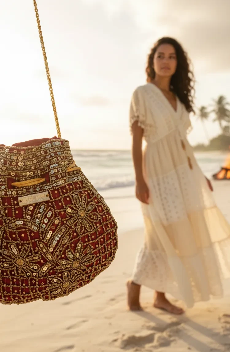 An exclusive evening accessory with a boho-chic flair, the golden sequin pouch bag is perfect for those seeking a unique and elegant touch. Its golden embroidery, delicate pearls, and shimmering details make it a standout piece that adds both personality and sophistication to your event outfit.