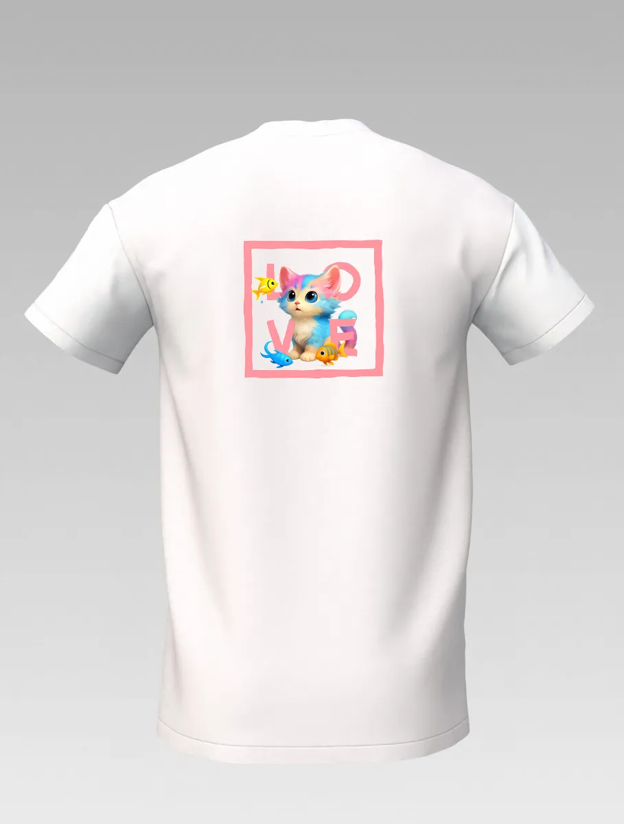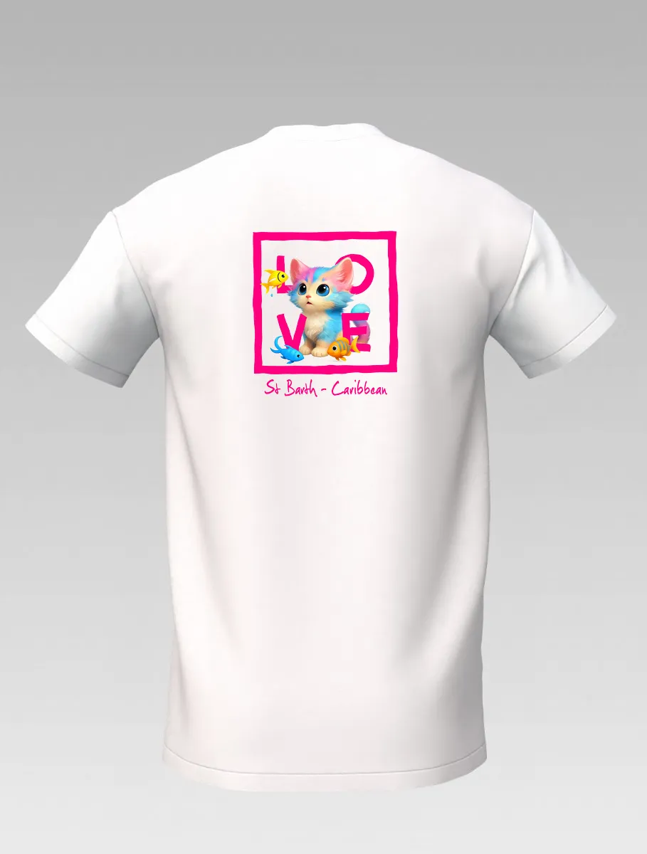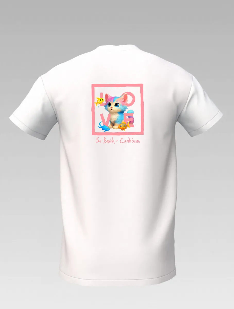 White Kids’ T-shirt – Playful Cat and Fish – St Barth & St Martin Signature – LOVE Edition